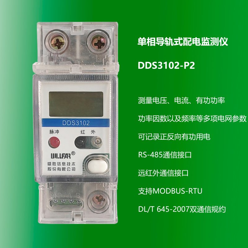 DDS3102-P2系列單相配電監測儀是一款集測量記錄、用電記錄、LCD屏幕顯示和網絡通信于一體的電力監測儀。本儀表可測量電壓、電流、有功功率、功率因數以及頻率等多項電網參數;可記錄正反向有功用電;RS-485通信接口和遠紅外通信接口支持MODBUS-RTU和DL/T 645-2007雙通信規約。